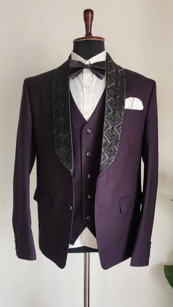 Men's Purple Embroidery Hand Work 3 Piece Suits